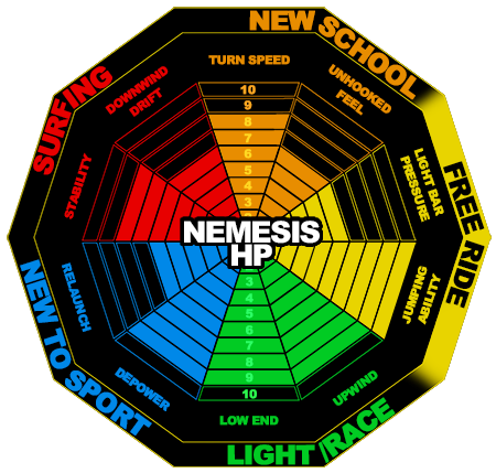 Der Nemesis HP v3 ist eine klare Verbesserung im Vergleich zu allen bisher da gewesenen Inkarnationen. Weiterentwicklungen im Canopy Design und ein überarbeitetes Bridle- Layout rücken Stabilität und Unhooked Performance noch weiter in den Vordergrund. Eine neue Auswahl von Materialien und umfassende Verfeinerung der Aerodynamik machen es möglich, dass dich der Nemesis HP v3 mit seinem explosiven Lift regelrecht vertikal vom Wasser reißt, sobald du abdrückst, und dich mit einem absolut einzigartigen Hangtime Gefühlt schweben lässt.